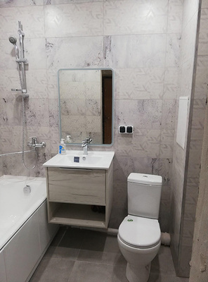 Мастер своего дела! С объёмом работы справился за день. Демонтировал старую раковину - установил новую со смесителем. Собрал и установил смеситель для душа. Повесил полку и зеркало.